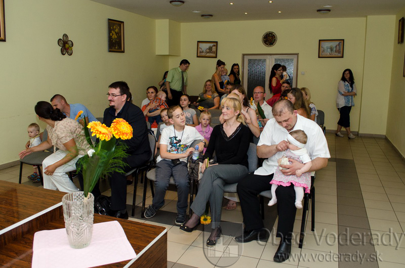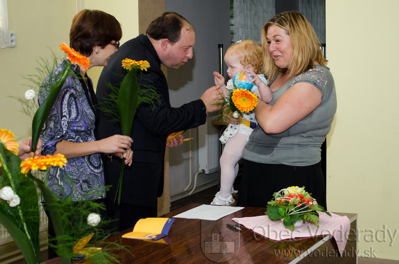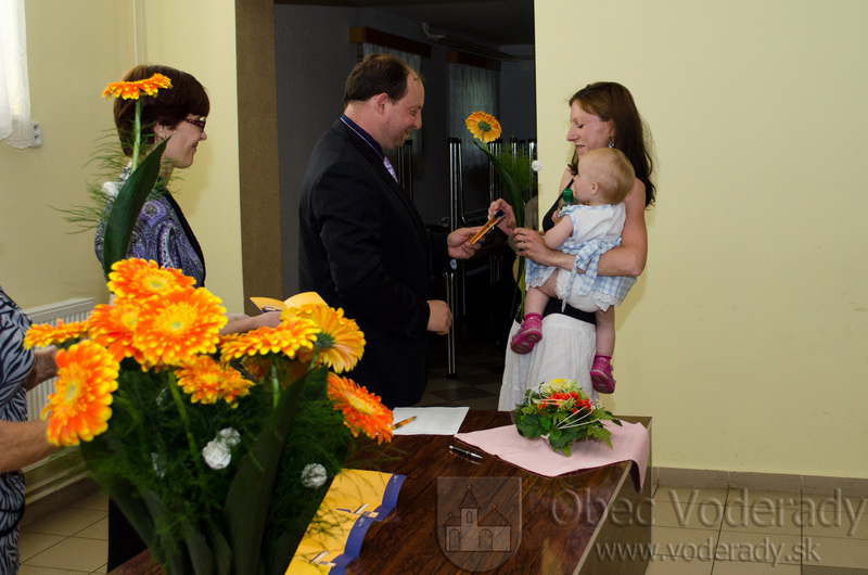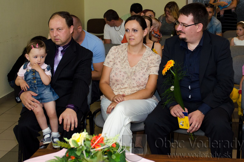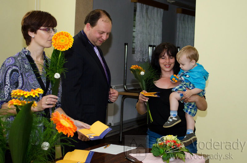 Zišli sme sa v krásne nedeľné popoludnie, aby sme pozdravili a privítali medzi nami nádejných občanov našej obce. Boli to: Jakub Adamec, Simona Bachratá, Zuzana Císarová, Lea Čičmišová, Tomáš Fatranský, Kristián Formanko, Soňa Gregušová, Maxim Krajčovič, Lukáš Luha, Igor Méri, Ariana Ela Popa, Alexandra Smolová, Patrik Vavrinčík a Damián Živický. Slávnostnú atmosféru umocnil hrou na hudobný nástroj pán Csaba Köböl. Vedenie obce Voderady v snahe podporiť mladé rodiny poskytuje novonarodeným deťom peňažný vklad ako základ na ich materiálne zabezpečenie. Po krátkom úvode a kultúrnom programe starosta obce JUDr. Marek Turanský odovzdal rodičom vkladné knižky, poprial im veľa zdravia, šťastia a trpezlivosti pri výchove ich detí. Mamičky boli obdarené krásnym kvetom.