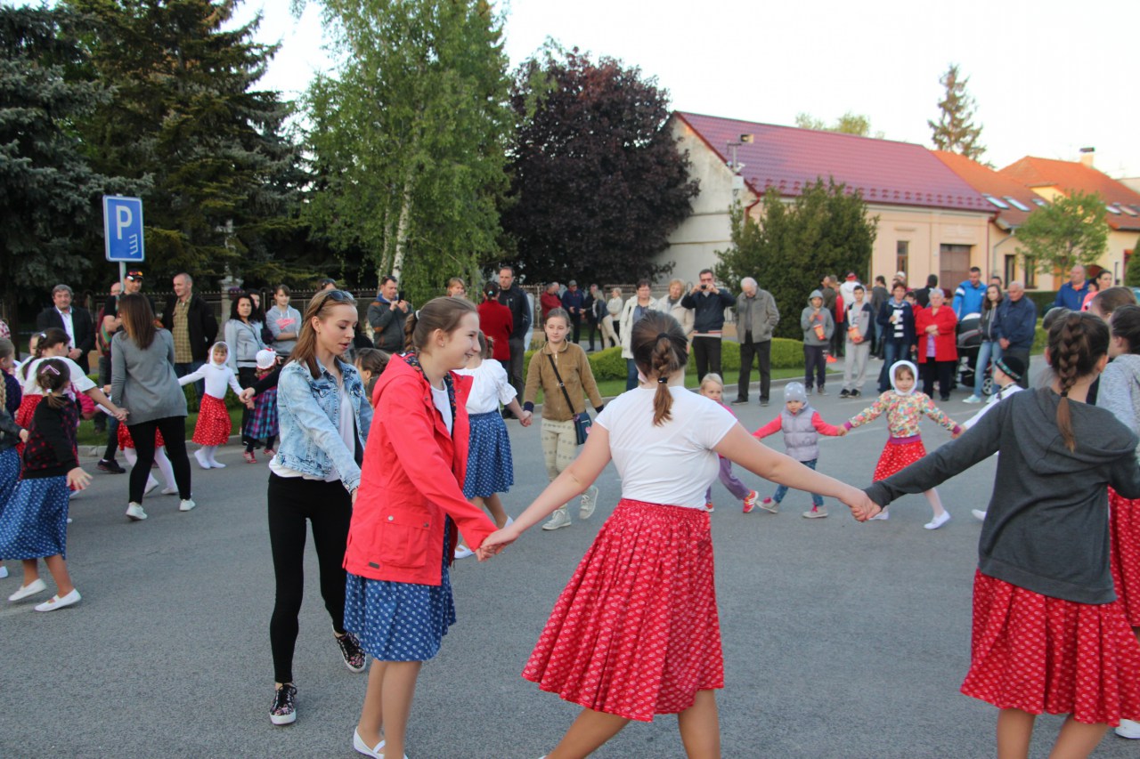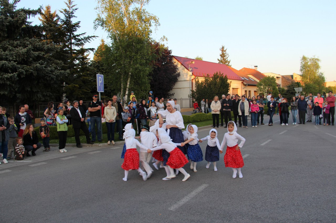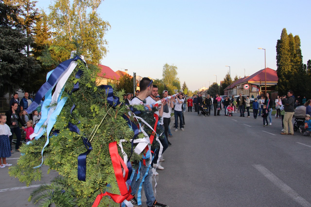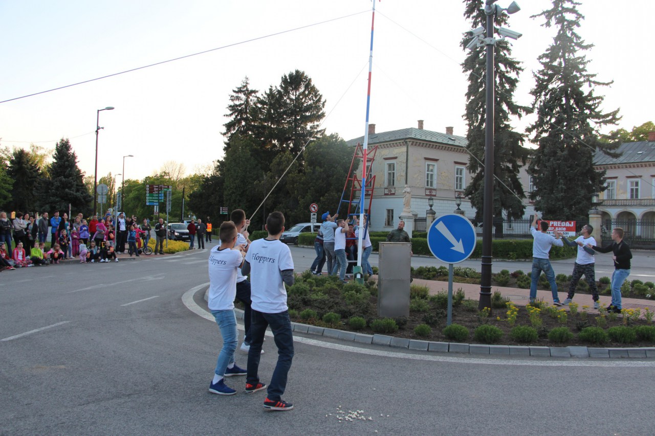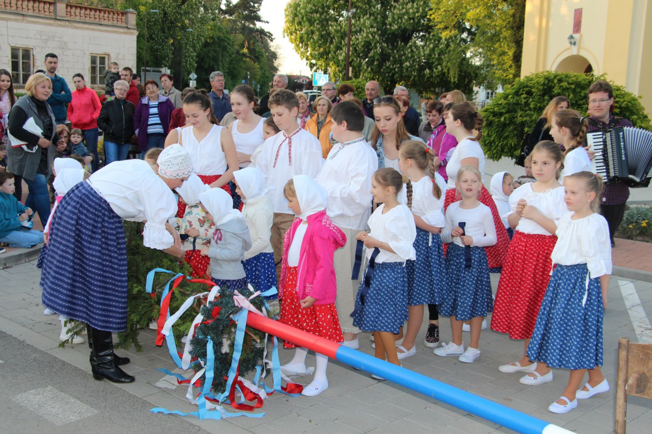 A podarilo sa ! Krásne dekorovaný Máj, ktorý stužkami dozdobili deti z folklórneho súboru z Materskej školy vo Voderadoch, pod vedením I. Táčovskej, sa za malú chvíľu nádherne týčil nad námestím. V kultúrnom programe okrem detí z materskej školy účinkovali aj žiaci z tanečného odboru ZUŠ vo Voderadoch. Za akordeónového hudobného sprievodu Mgr.art. Michala Matejčíka si spoločne s deťmi zaspievali aj speváci zo speváckeho zboru Prameň z Voderád.
