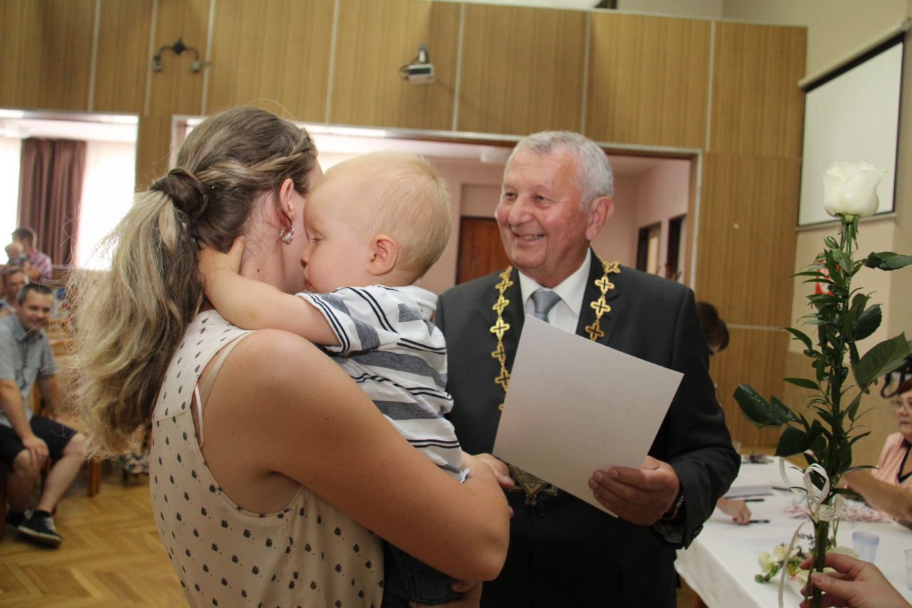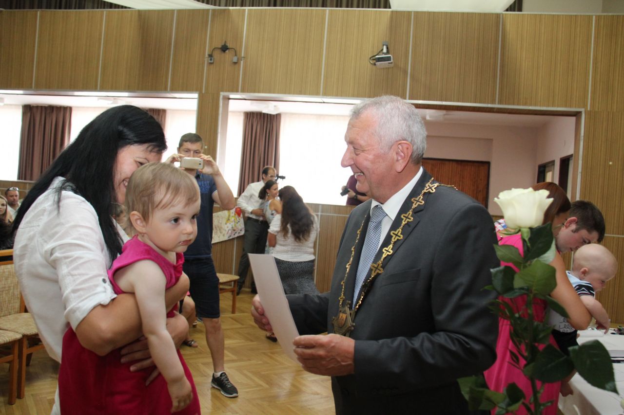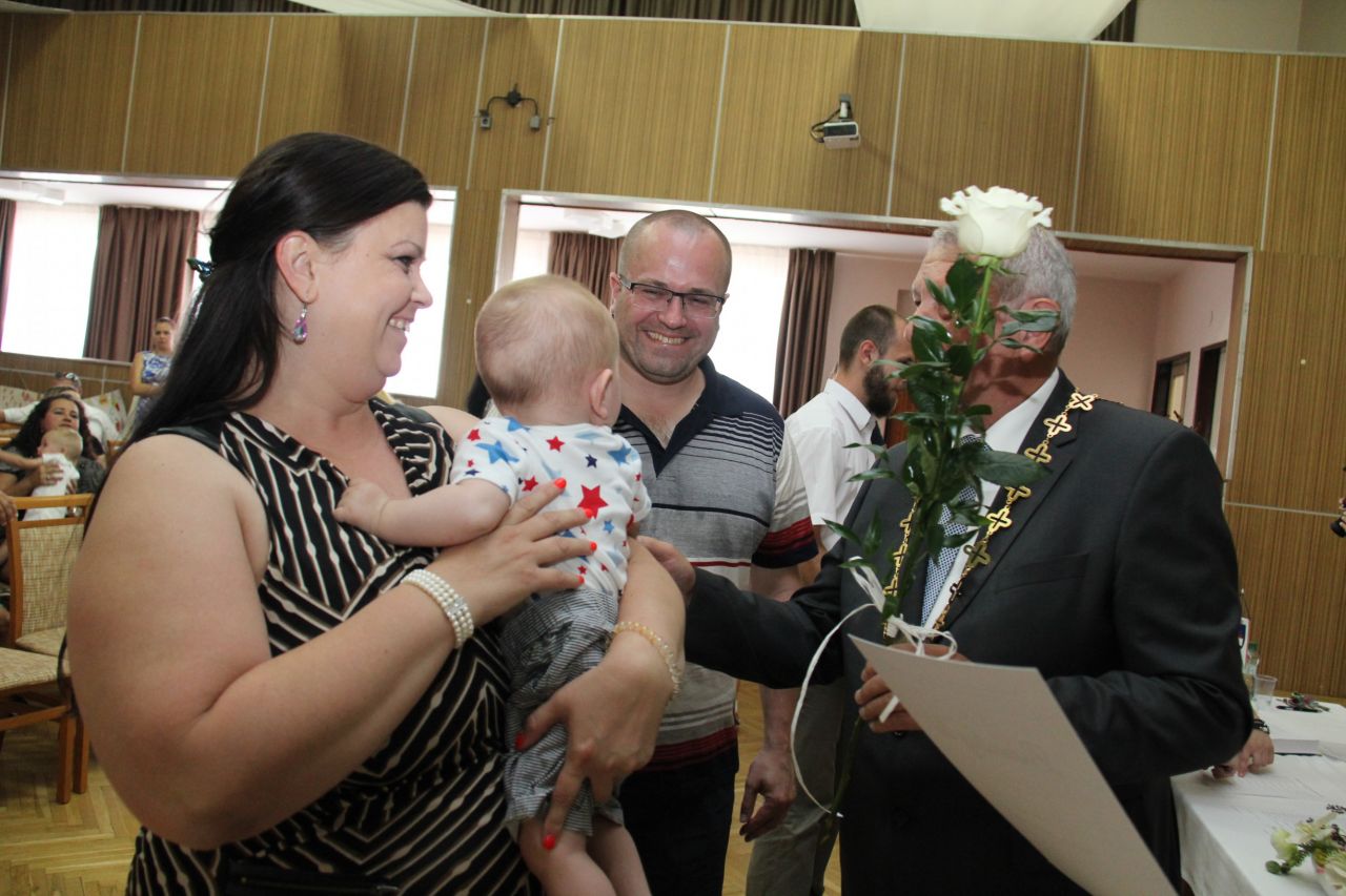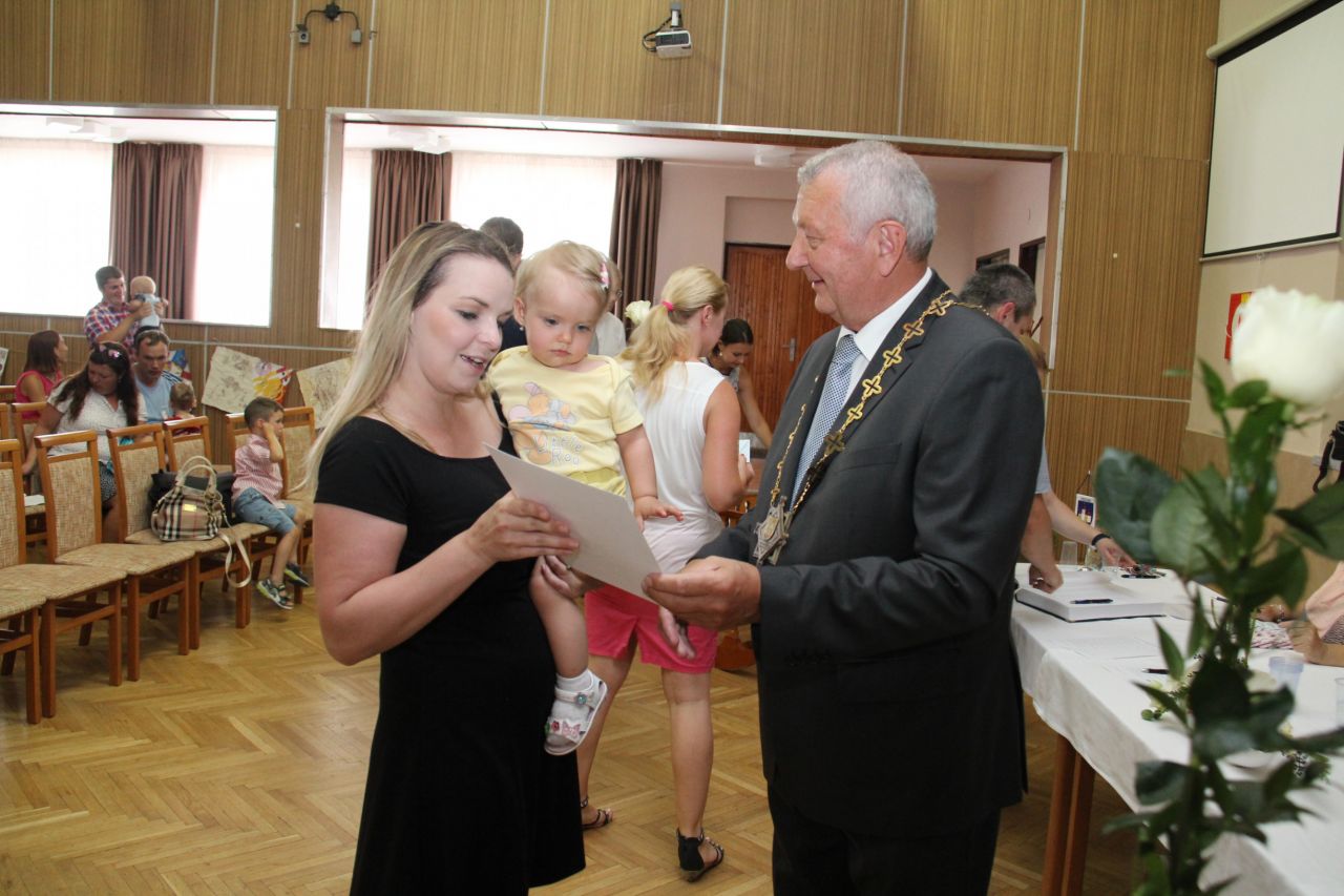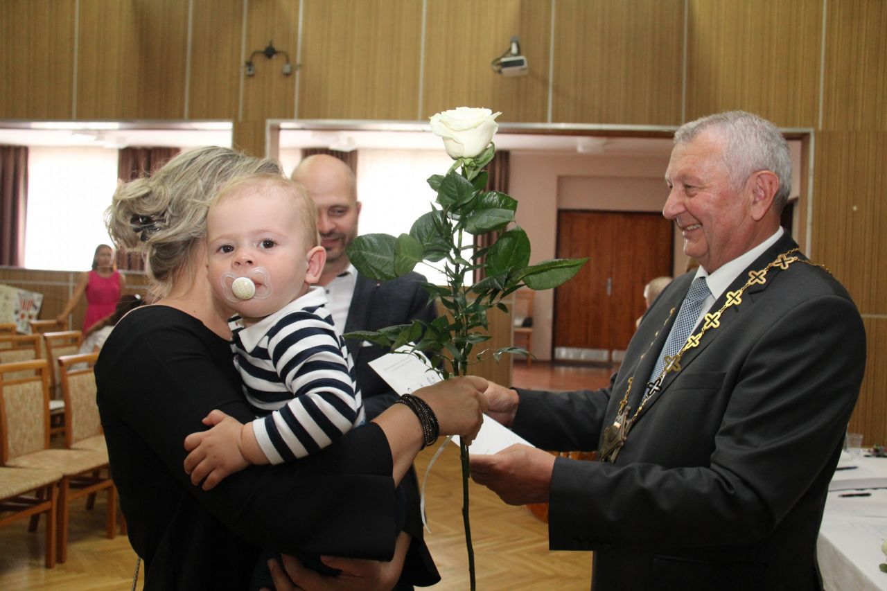 Následne starosta obce odovzdal rodičom pamätný list, mamičkám bielu ružu a finančnú hotovosť 200,-- Eur. ( Pozn. : Podmienky poskytnutia finančného príspevku novonarodeným deťom upravuje VZN obce Voderady č. 6/2016. )