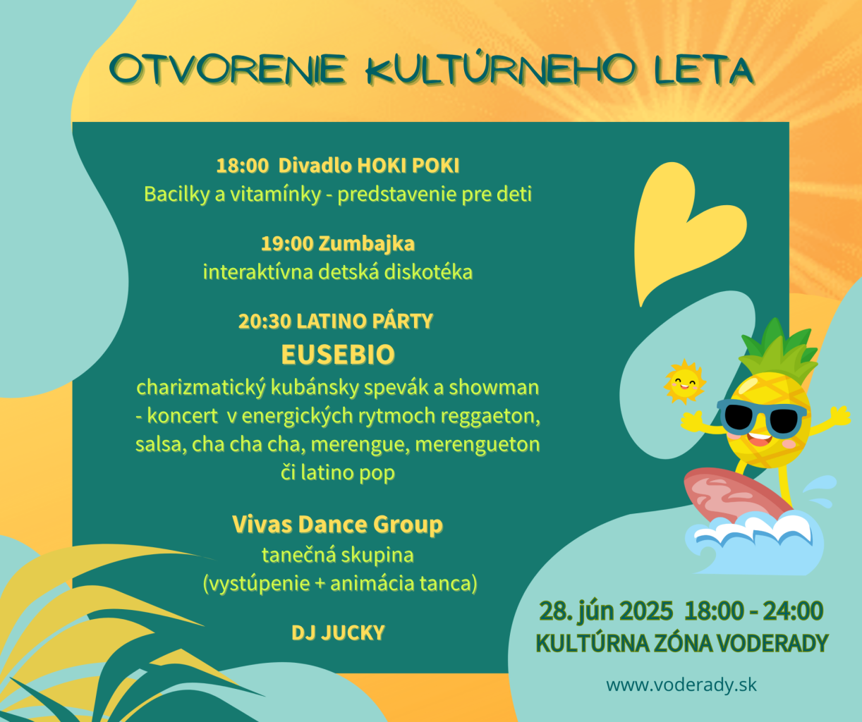 Leto je tu a my sa naladíme na letné kultúrne večery vo veľkom štýle! Srdečne vás pozývame na otvorenie Kultúrneho leta, ktoré sa uskutoční v sobotu 28. júna 2025 v našej obľúbenej Kultúrnej zóne vo Voderadoch. Pripravili sme pre vás program plný zábavy, hudby, tanca a spolu s vami aj príjemnej letnej atmosféry ![]()