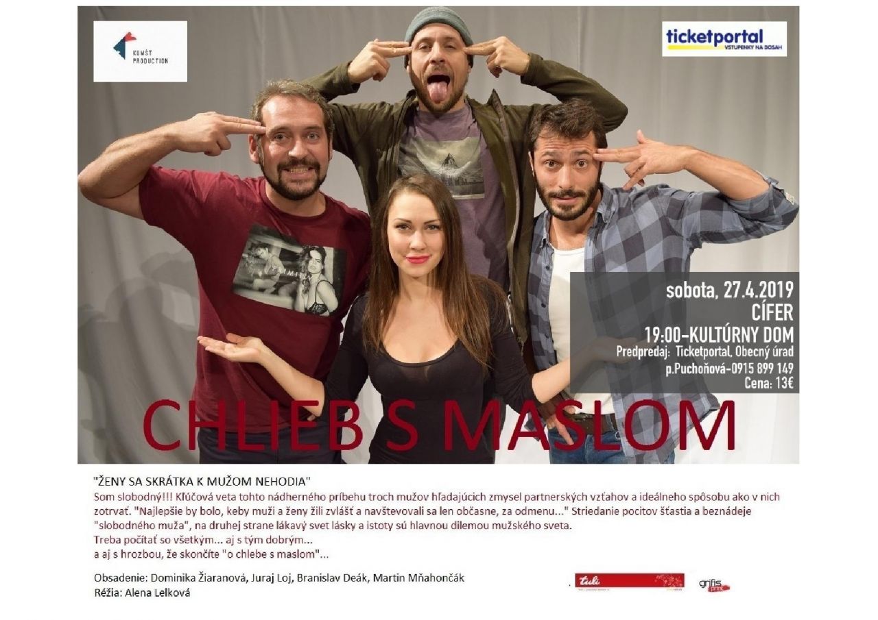 Divadelné predstavenie Chlieb s maslom (so známym hereckým obsadením D.Žiaranová, J. Loj, B. Deák a M.Mňahončák)
