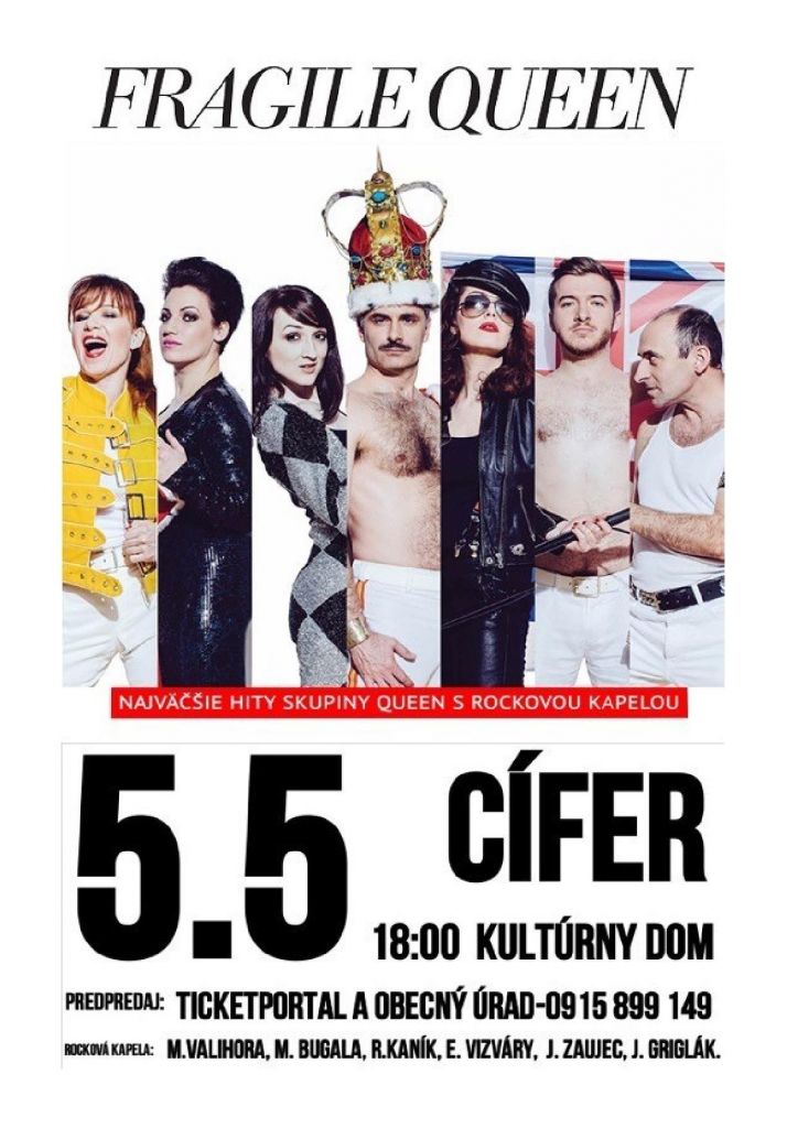 Najväčšie hity skupiny QUEEN s rockovou kapelou. Vstupenky na podujatie si môžete zakúpiť na Obecnom úrade v Cíferi počas stránkových hodín, u p. Puchoňovej tel.č.: 0915 899 149 a v sieti Ticketportal.
