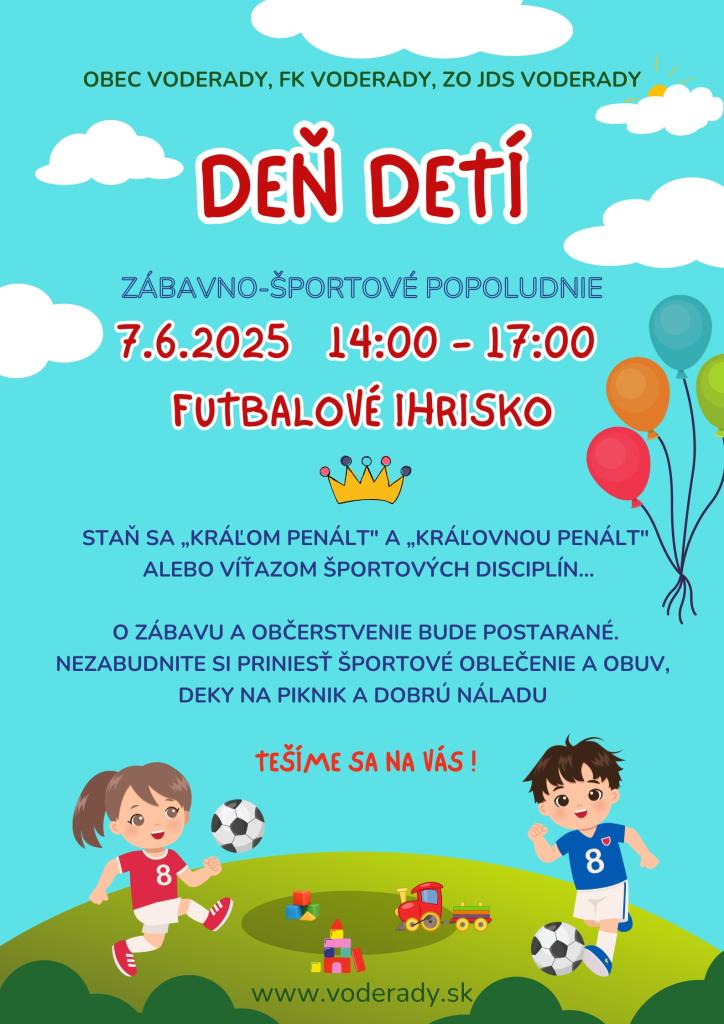 Príďte si spolu s nami užiť zábavno-športové popoludnie a osláviť sviatok všetkých detí. Podujatie pripravuje Obec Voderady, FK Voderady a ZO JDS Voderady. O zábavu a občerstvenie bude postarané. Nezabudnite si priniesť športové oblečenie a obuv, deky na piknik a dobrú náladu.