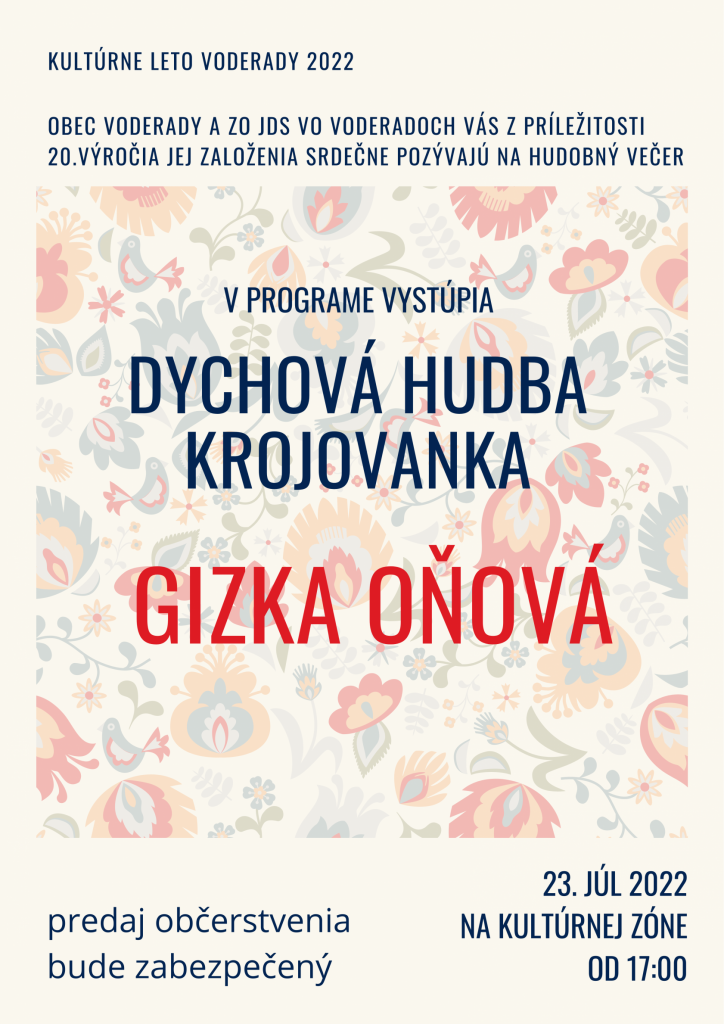 V rámci Kultúrneho leta Voderady 2022 sme do programu zaradili hudobný večer z príležitosti 20. výročia založenia Základnej organizácie Jednoty dôchodcov Slovenska vo Voderadoch. Na túto malú slávnosť , ktorej začiatok bude o 17:30 hod. na Kultúrnej zóne v centre obce Voderady všetkých srdečne pozývame.