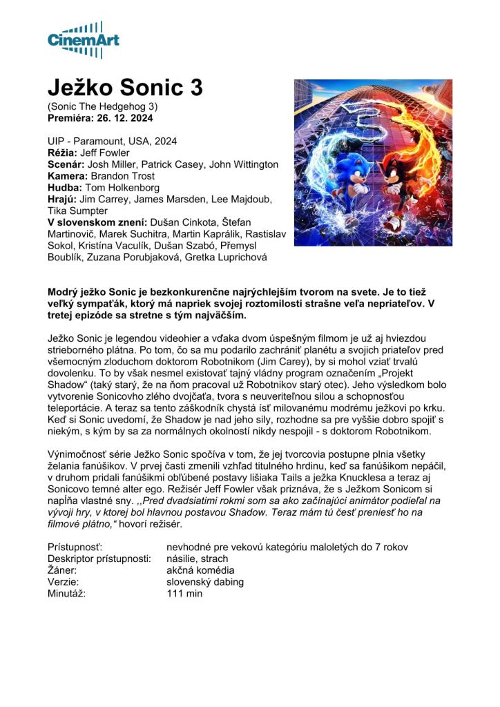 JEŽKO SONIC 3 v letnom kine pod gaštanom - UŽ TENTO PIATOK o 20:30 !