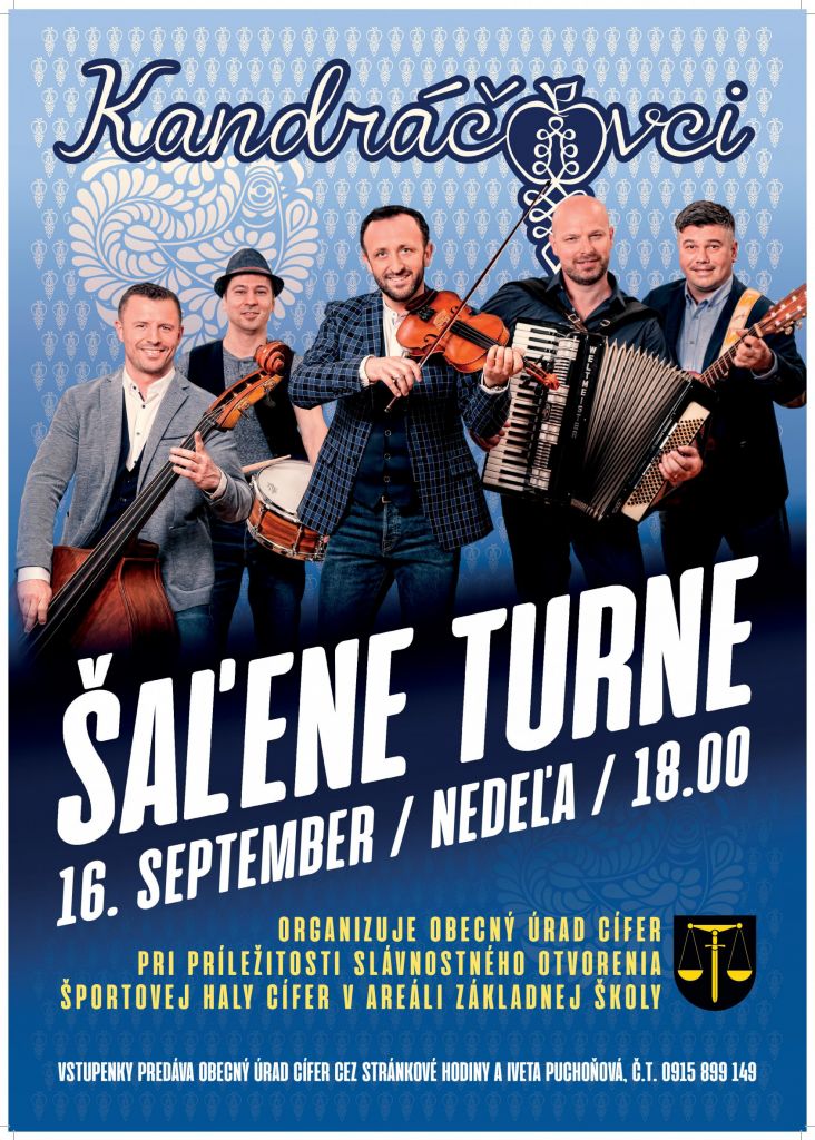 Obecný úrad v Cíferi všetkých srdečne pozýva na koncert Kandráčovcov, pri príležitosti slávnostného otvorenia novej športovej haly. Viac info na plagáte.