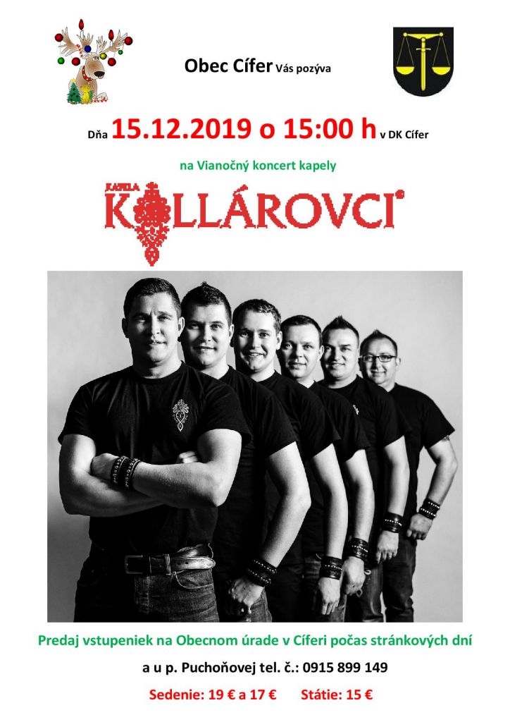 Obec Cífer Vás pozýva dňa 15.12.2019 o 15:00 hod. do Domu kultúry na vianočný koncert kapely Kollárovci.