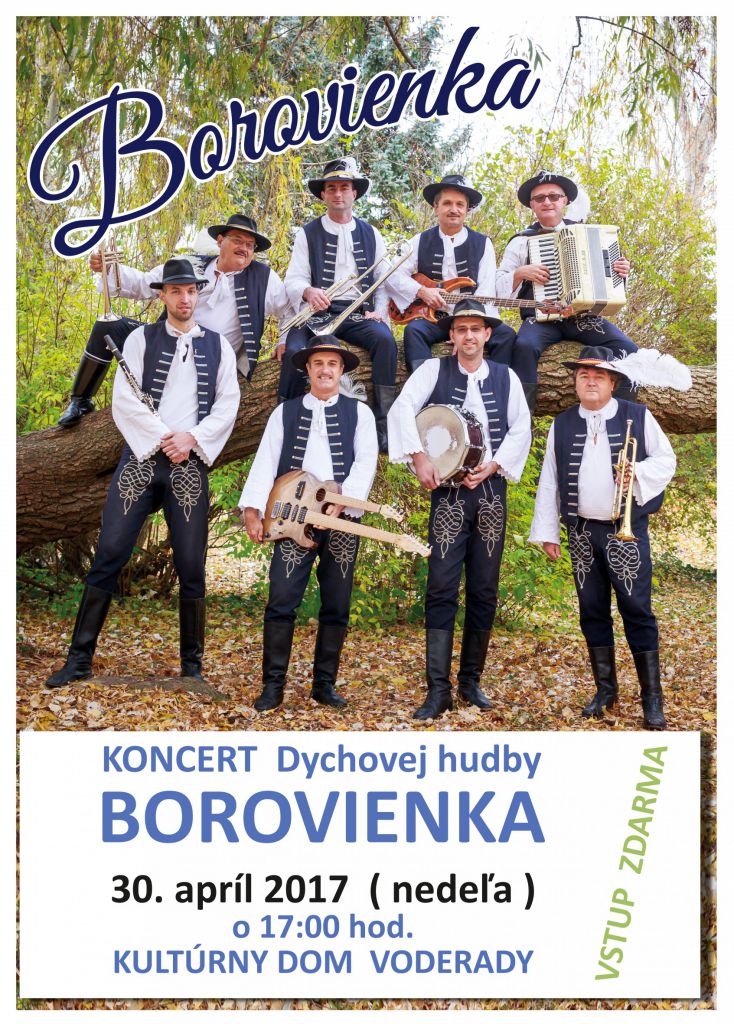 Obec Voderady , Kultúrna komisia OZ vo Voderadoch Vás srdečne pozývajú na predmájový sviatočný koncert Dychovej hudby Borovienka