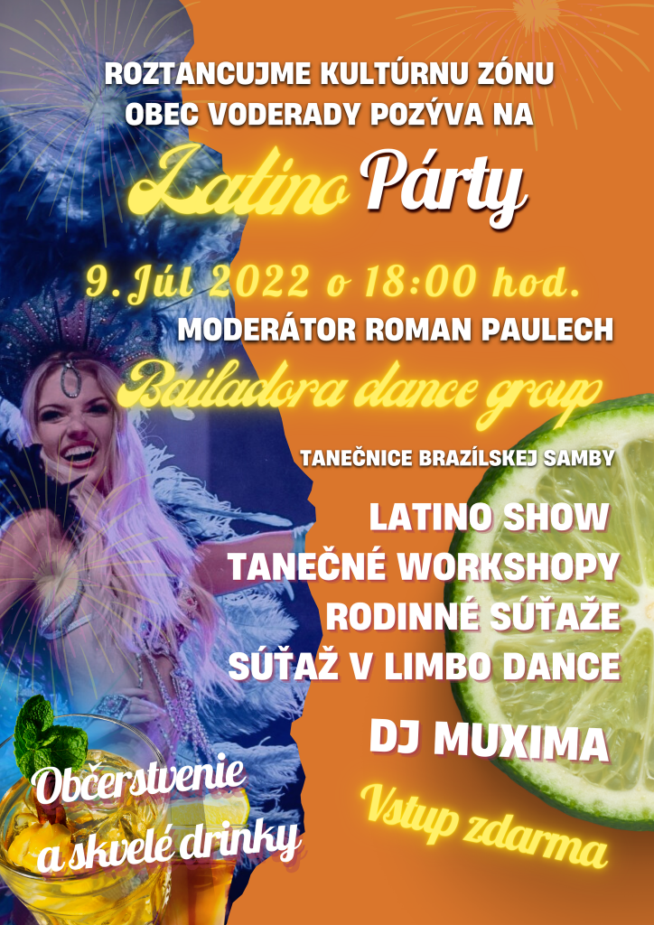 9. júla o 18-tej hodine otvorí Kultúrne leto vo Voderadoch skvelá Latino párty, súčasťou ktorej bude nezabudnuteľná Latino Show v podaní tanečnej skupiny Bailadora Dance Group. Predstavia sa vám Tanečnice Brazílskej alebo Exkluzívnej/Honosnej Brazílskej Samby. Bailadora Dance Group má okrem tanečnej školy pripravené Tanečné workshopy pre deti aj dospelých, Family activities (rodinné súťaže) alebo tiež súťaž v Limbo Dance, ktoré budú odmenené vecnými cenami. Už od 17-tej hodiny bude pre deti pripravené Maľovanie na tvár , malé aj veľké slečny , alebo aj dámy si môžu nechať pred tancovačkou zapliesť štýlové copíky. Celým programom vás bude sprevádzať známy moderátor Roman Paulech. Návštevníkov počas latino večera roztancuje okrem krásnych tanečníc aj DJ MUXIMA. Diskotéka bude pokračovať do 23.hodiny. Nebudú chýbať drinky, Fefe-café ,cigánska pečienka, čapované pivo, kofola, štrúdle, bratislavské rožteky a stánok so sladkosťami a pukancami. Pozývame všetkých na skvelú letnú latino disco show ! Pozývame všetkých na skvelú letnú latino disco show ! VSTUP ZDARMA !