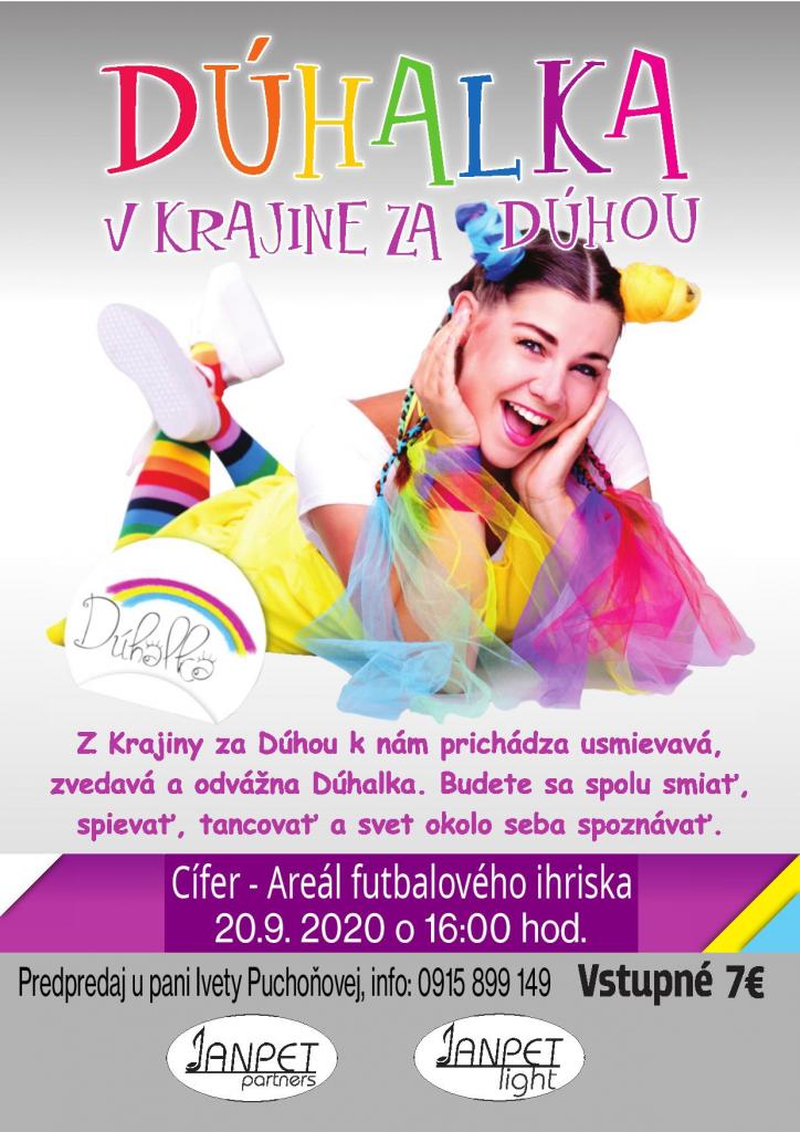 Obec Cífer vás srdečne pozýva na interaktívny koncert pre deti „DÚHALKA“, ktorý sa uskutoční dňa 20.9.2020, t.j. v nedeľu o 16.00 h v exteriéri – na futbalovom štadióne v Cíferi. Vstupné je 7 EUR.