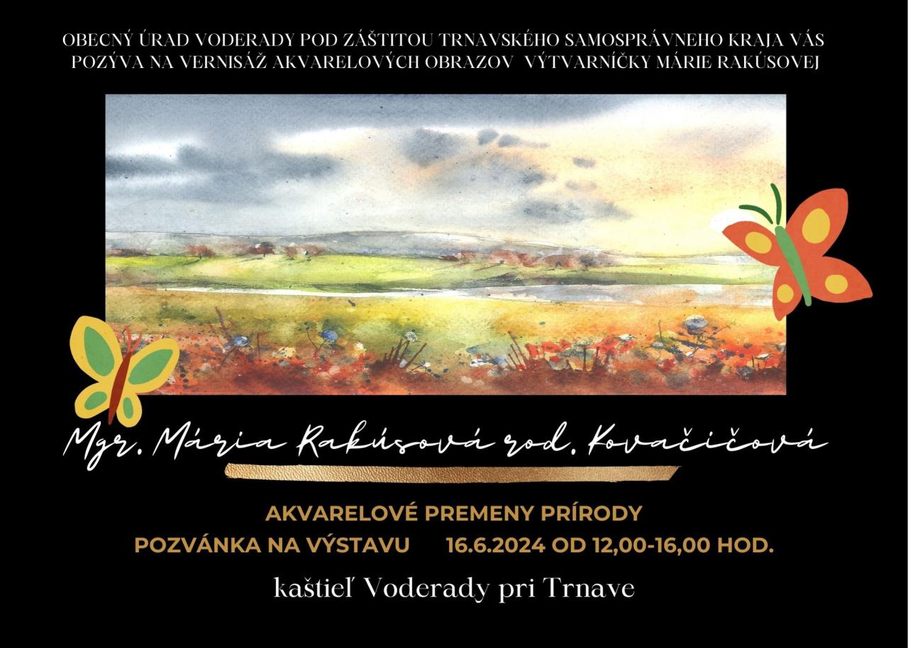 Obecný úrad vo Voderadoch pod záštitou Trnavského samosprávneho kraja Vás pozýva na vernisáž akvarelových obrazov výtvarníčky p. Márie Rakúsovej, rod. Kovačičovej pod názvom "AKVARELOVÉ PREMENY PRÍRODY", ktorá sa uskutoční dňa 16.06.2024 od 12:00 do 16:00 hod. v kaštieli vo Voderadoch.