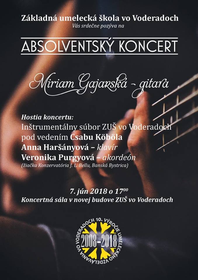 ZUŠ vo Voderadoch Vás srdečne pozýva na Absolventský koncert Miriam Gajarskej a jej hostí. Koncert bude prvým verejným podujatím v priestoroch novej školy. Na koncerte sa predstavia aj deti z inštrumentálneho súboru a bývalé absolventky Anička Haršányová a Veronika Purgyová.