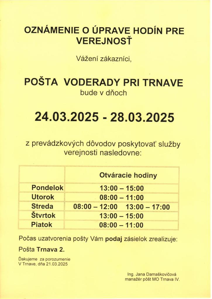 Pošta Voderady pri Trnave oznamuje dočasnú zmenu otváracích hodín. Viac informácií v prílohách.