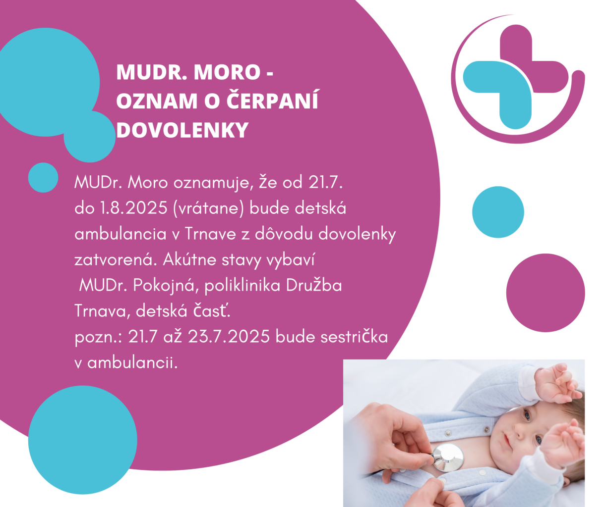 MUDr. Moro oznamuje, že od 21.7. do 1.8.2025 (vrátane) bude detská ambulancia v Trnave z dôvodu dovolenky zatvorená. Akútne stavy vybaví MUDr. Pokojná, poliklinika Družba Trnava, detská časť. pozn.: 21.7 až 23.7.2025 bude sestrička v ambulancii.