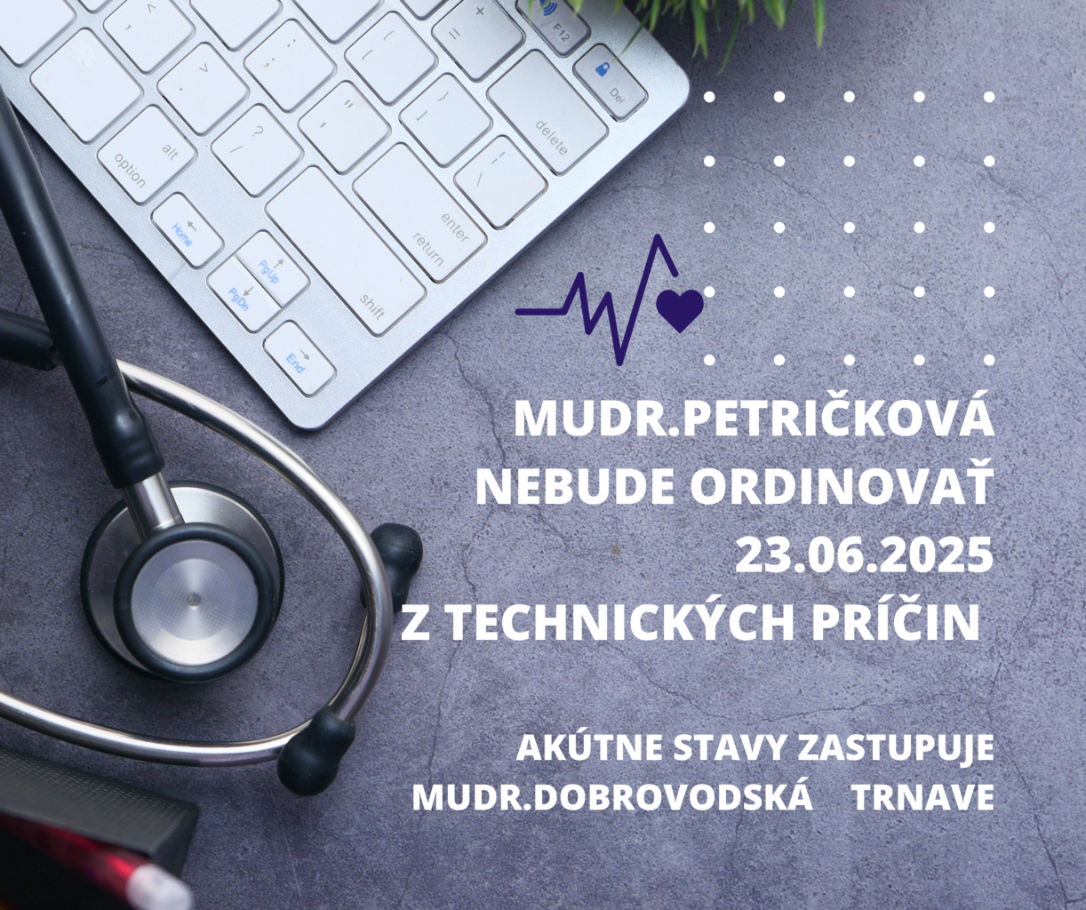Oznamujeme občanom,že MUDr. Petričková nebude ordinovať dňa 23.06.2025, t.j. v pondelok, z technických príčin. Akútne stavy zastupuje MUDr. Dobrovodská v Trnave.