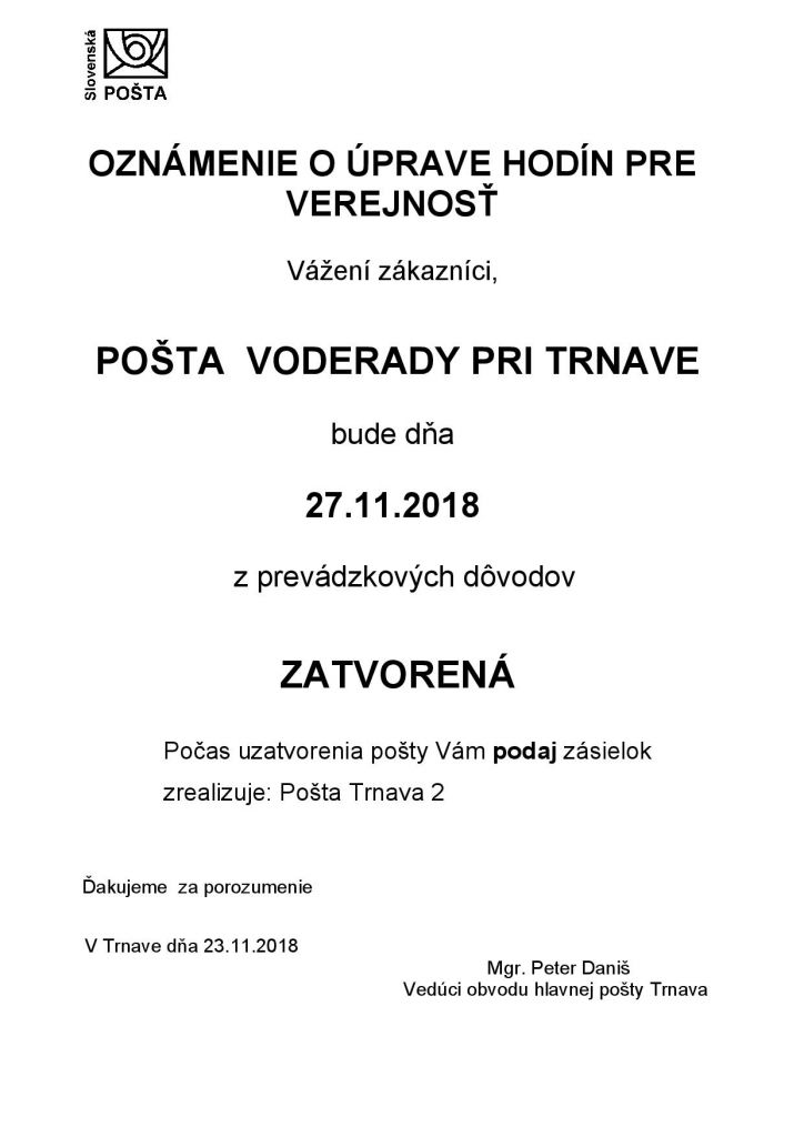 Oznamujeme občanom, že dňa 27. 11. 2018 bude Pošta vo Voderadoch z prevádzkových dôvodov zatvorená.