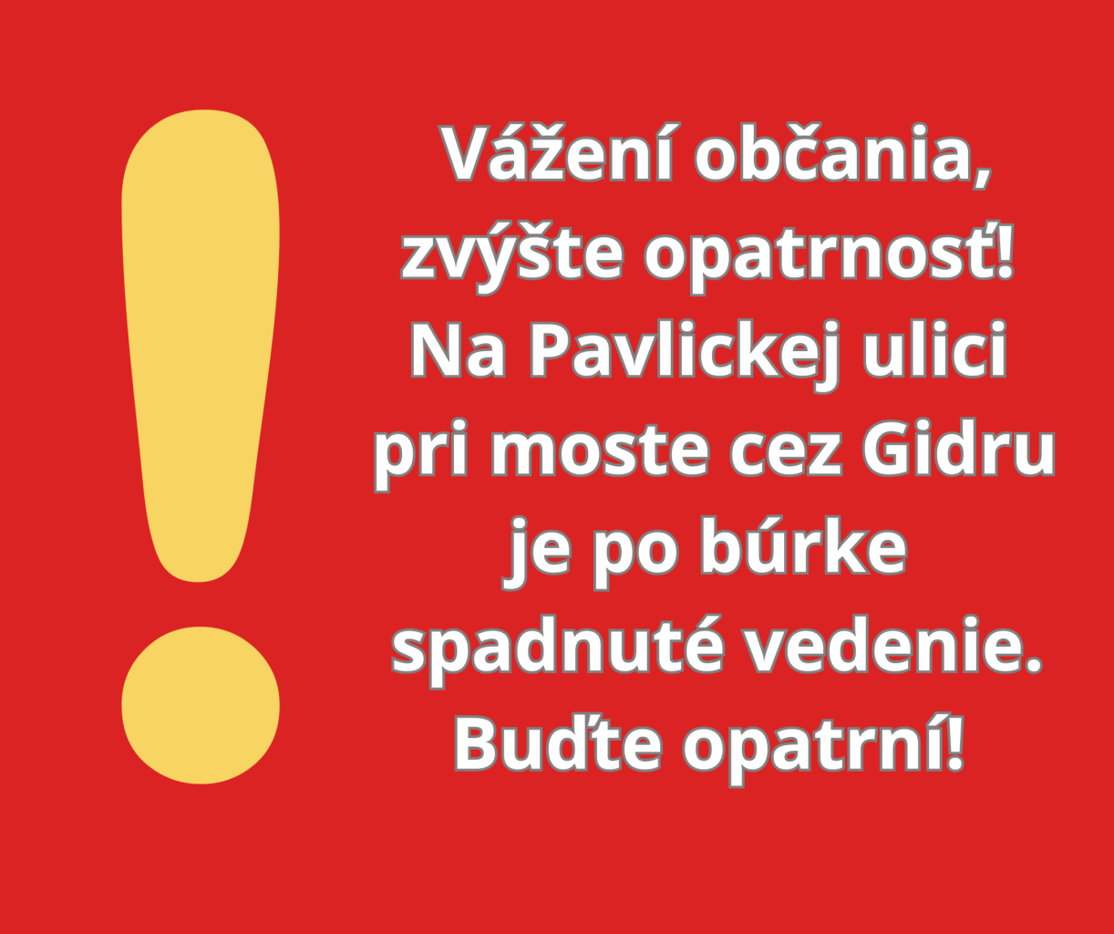 Vážení občania,zvýšte opatrnosť! Na Pavlickej ulici pri moste cez Gidru je po búrke spadnuté vedenie. Buďte opatrní!
